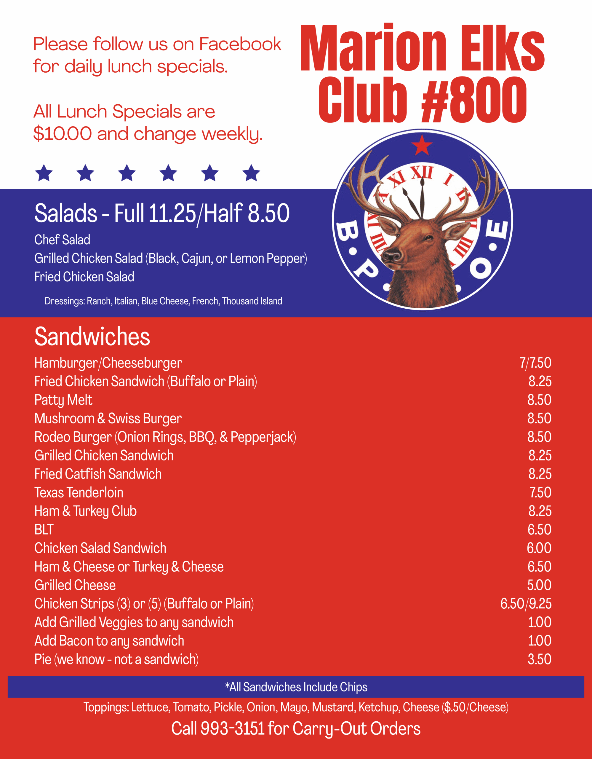The Elks Lodge is open for lunch to the membership, their guests, and all others Monday – Friday from 10:30 a.m. serving until 1:00 p.m. A variety of Sandwiches, Salads, Soups and daily special are available. Lunch at the Lodge is also available for private parties, banquets, meetings and special occasions every day. Please contact our banquet manager for reservations, sponsorships and membership information at 618-993-3151. Follow us on Facebook for weekly lunch special menus.